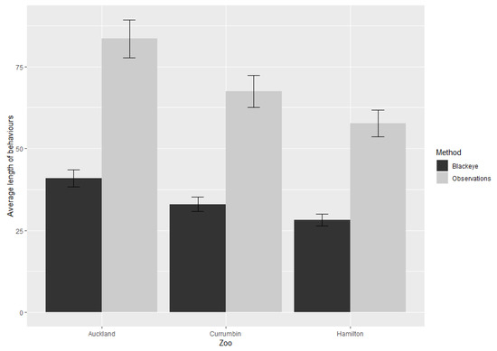 There were overlaps in the duration of a behaviour between zoos (Figure 2), but no overlaps occurred when observational methods were compared (Figure 2). Pairwise comparisons showed differences in mean length (seconds) of behaviours between all zoos (Auckland/Currumbin: p < 0.0001) (Auckland/Hamilton: p < 0.0001) (Currumbin/Hamilton: p < 0.0001). The observational method showed differences in the mean length of behaviours at the different zoos.