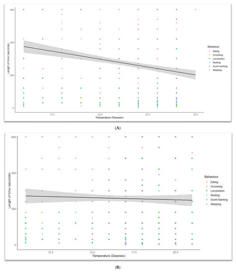 Daytime temperatures during observations (Table 4) ranged from 11 °C at Hamilton Zoo to 32 °C at CWS. When drop1 chi-square tests were carried out, the duration of behaviours was significantly affected by temperature (Auckland Zoo (ꭓ2 = 977.66, DF = 1, p < 0.001), Hamilton Zoo (ꭓ2 = 914.94, DF = 1, p < 0.001), and CWS (Temperature: ꭓ2 = 483.11, DF = 1, p < 0.01)). Short-duration behaviours, such as scent marking, locomotion, and eating, occurred less often in hotter conditions (Figure 3A–C). Scent marking increased at Auckland Zoo (Figure 3A) between 21 °C and 24 °C, but was not observed at all over 29 °C at CWS (Figure 3C). Locomotion length and frequencies changed with increasing temperatures (Figure 4). More time was given to resting and sleeping (Figure 5) as the temperature increased. All behaviours, and durations of behaviour, were performed at all temperatures at Auckland Zoo and Hamilton Zoo (Figure 3B). The most significant change in behaviours performed was seen at CWS, when temperatures increased above 29 °C.