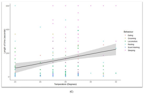 Showing how the duration of behaviours was influenced by temperature at different zoo sites. The five most common behavioural categories were picked for this graph as defecation, interactions, playing, and scent marking occurred infrequently. (A) Auckland Zoo, Adj R2 = 0.052105, Intercept = 954.88, Slope = −30.654, p = 1.7274 × 10−5; (B) Hamilton Zoo, Adj R2 = −0.0012626, Intercept = 264.26, Slope = −0.022011, p = 0.99485; (C) Currumbin Wildlife Sanctuary, Adj R2 = 0.024695, Intercept = −362.83, Slope = 18.718, p = 0.0011086. (black line: Estimated means, grey shadow: +95 CI) v 1.4.7.