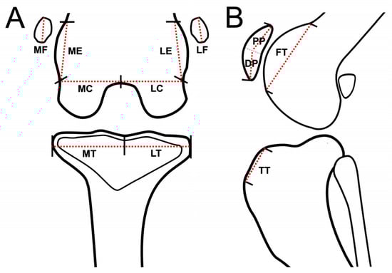 The osteophytes/enthesophytes in 12 anatomical compartments of the medial femoral epicondyle (ME), lateral femoral epicondyle (LE), medial femoral condyle (MC), lateral femoral condyle (LC), medial proximal tibial plateau to edge (MT), lateral proximal tibial plateau to edge (LT), femoral trochlear ridges (FT), tibial tuberosity (TT), medial fabella (MF), lateral fabella (LF), distal patella (DP), and proximal patella (PP) were evaluated using DR, CT, and MRI (Figure 1) [11]. The sum of the maximum width and height of osteophytes/enthesophytes obtained from the images was divided by the length of the anatomic midlines (AM). The results were then scaled from 0 to 3 (0: none; 1: <25%; 2: 25–50%; 3: >50%).