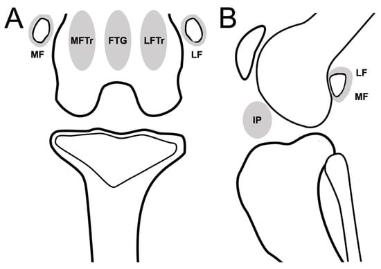 The presence of synovial effusion in the infrapatellar region (IP) was recorded in the lateral view of the DR or sagittal planes of the CT and MRI images, and the maximum potential distention of the synovial cavity was scaled from 0 to 3 (0: normal; 1: ≤33%; 2: 33–66%; 3: ≥66%) [13]. The presence of synovial effusion extensions at the MF, LF, medial femoral trochlear ridges to the epicondyle region (MFTr), lateral femoral trochlear ridges to the epicondyle region (LFTr), and femoral trochlear groove (FTG) was recorded on MRI only (Figure 2). In addition, synovial membrane thickening was observed on MRI.