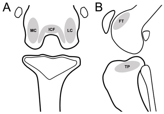 Schematic representation of stifle joint anatomic compartments for evaluating subchondral lesion in the dorsal plane (CT or MRI)/caudocranial view (DR) (A), and sagittal plane (CT or MRI)/mediolateral view (DR) of stifle joint (B). Stifle joint is divided into 6 subregions to evaluate subchondral lesions. Abbreviations: FT, femoral trochlear; ICF, femoral intercondylar fossa; LC, femoral lateral condyle; MC, femoral medial condyle; TP, tibia plateau.