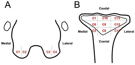 Schematic representation of stifle joint anatomic compartment subregions to evaluate cartilage lesion on MRI images: dorsal plane of the distal femur (A) and proximal tibia (B). Stifle joint is divided into 13 anatomic subregions to evaluate cartilage lesions: lateral part (A, C1) and medial condyle medial (A, C2); lateral condyle medial (A, C3) and lateral part (A, C4); tibia plateau medial region cranial (B, C5), middle (B, C6), and caudal part (B, C7); tibia plateau middle region cranial (B, C8), middle (B, C9), and caudal part (B, C10); tibia plateau lateral region cranial (B, C11), middle (B, C12), and caudal part (B, C13).