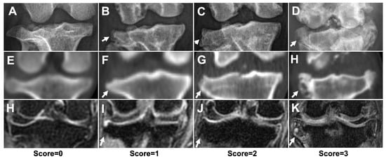 The severity of osteophytes/enthesophytes of stifle joint using different imaging modalities. Representative DR (A–D), CT (E–H), and MRI (H–K) images, with score = 0 (A,E,H), score = 1 (B,F,I), score = 2 (C,G,J), and score = 3 (D,H,K). White arrows indicated osteophytes/enthesophytes formation at lateral proximal tibia edges. The score = 0 images were acquired from a dachshund which was not included in this study.