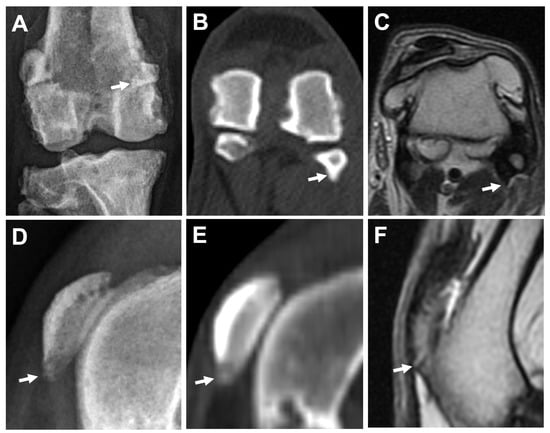The subchondral lesion or bone marrow lesion may indicate inflammation, edema, and ischemic condition of the bone marrow [26,27,28], which presents as T2W and PDW hyperintense lesions on MRI. Nevertheless, DR and CT provide details of bony structures, such as subchondral bone defects or cysts. Our results revealed that subchondral lesions at the FT were only noted on DR images. Combining the CT and MRI findings of the same joint, these lesions resulted from the superimposition of regional osteophytes with trochlear ridges rather than “true” subchondral lesions (Figure 9). Therefore, the findings of DR imaging, used to detect subchondral lesions in the FT subregion, should be interpreted with caution. Although subchondral bone plays a crucial role in the initiation and progression of human OA [29], the clinical values still can not be identified here due to the chronic OA stage and single time point for assessment. However, a previous study demonstrated that the abnormal bone metabolism was detected before subchondral bone lesion formatted in human OA, and the sodium fluoride positron emission tomography/CT coregistered with MRI could serve as a feasible molecular imaging modality to assess early post-traumatic OA [30].