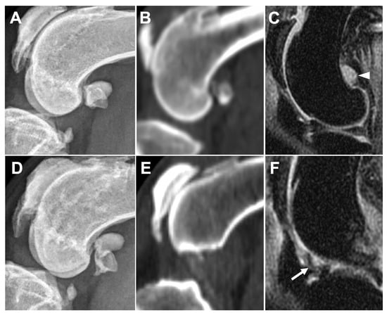 Comparison of medial fabella synovial effusion on DR (A), CT (B), and MRI (C), and infrapatellar synovial membrane thickening on DR (D), CT (E), and MRI (F) in the same leg. Obvious synovial effusion (arrowhead) is seen at the medial fabella region on MRI image (C) but cannot be observed on DR (A) or CT (B) images. Synovial membrane thickening is seen as low intense signal inside the synovial cavity (arrow) on MRI (F) but cannot be observed on DR (D) or CT (E) images.