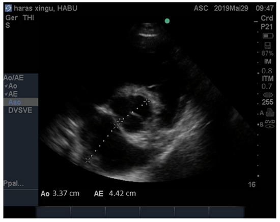 The diameter of the left atrium (LA) and the aorta on the same plane was measured, and subsequently, the left atrium/aorta ratio was calculated (LA/Ao) (Figure 2). Pulmonary flow velocity (pulmonary velocity) and pressure gradient between the right ventricle and pulmonary artery at the level of the pulmonary plane was also measured.