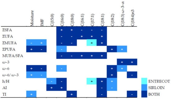 In sirloin, the IMF content samples correlated positively with the total content of monounsaturated fatty acids due to the oleic acid content and inversely with the content of polyunsaturated fatty acids or PUFAs (Figure 1). In entrecote and sirloin, the human health-related indexes AI and TI correlated negatively with unsaturated fatty acids but positively with saturated fatty acids, while the opposite was true for the h/H ratio.