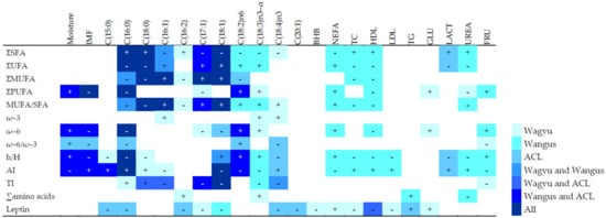 Pairwise correlations among health-related indexes, total content of different fatty acid types, specific fatty acids, and blood metabolites analyzed separately by experimental group, in Wagyu, Wangus, and Angus-by-Charolais or Limousine steers, regardless of meat cut. Only correlations for which Spearman’s coefficient had an absolute value > 0.4 and p < 0.001 are shown. “+” symbol indicates a positive correlation; “-” indicates a negative correlation. AI: atherogenic index; BHB: β-hydroxybutyrate; FRU: fructosamine; GLU: glucose; HDL: high-density lipoprotein cholesterol; h/H: hypocholesterolemic/hypercholesterolemic index; IMF: intramuscular fat in fresh matter; LACT: lactate; LDL: low-density lipoprotein cholesterol; MUFA: monounsaturated fatty acid; NEFA: non-esterified fatty acid; PUFA: polyunsaturated fatty acid; SFA: saturated fatty acid; TC: serum total cholesterol; TG: triglycerides; TI: thrombogenicity index; UFA: unsaturated fatty acid; ∑: total content; ω–3: omega-3 fatty acids; ω–6: omega-6 fatty acids; ω–6/ω–3: ratio of ω–6 to ω–3 fatty acid.