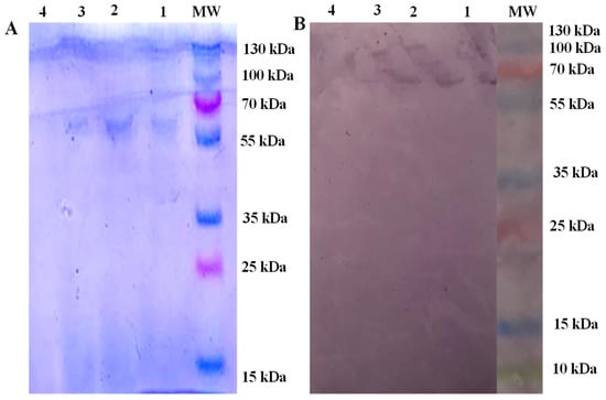 For the antigen characterisation of BHCF, the hydatid cyst fluid collected from buffalo was confirmed to be Echinococcus granulosus based on species-specific primers targeting the mtDNA ND1 gene. The BHCF recovered from animals positive for echinococcosis, analysed via SDS-PAGE and stained with Coomassie blue, revealed an infected E. granulosus 67 kDa (IEg67 kDa) band and this was confirmed via WB analysis (Figure 1A,B). There was also a 130 kDa band present in the SDS-PAGE, potentially representing a dimer (Figure 1A) that was not explored further.