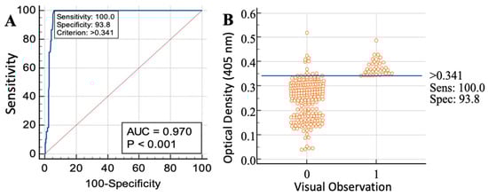 The sensitivity and specificity of ELISA based on the crude antigen was 100% and 93.8%, respectively (Figure 2A,B).