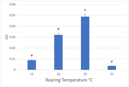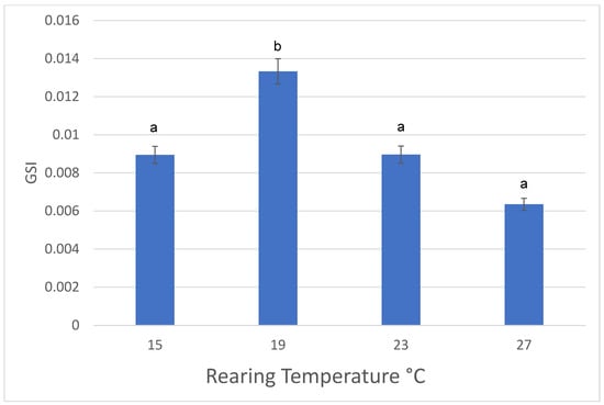 Gonadosomatic index (GSI) was obtained by the dividing testis or eggs mass versus the body mass (in grams). GSI is widely used in studies of reproductive cycles of different groups of animals [29,30,31,32]. These data were arcsine square root transformed to minimize the heterogeneity of variances among treatments [33]. Body size data were log-transformed before analysis. An ANOVA was performed on these data using the Excel2016.lnk software package (Microsoft, Redmond Washington, DC, USA) to analyze the effect of rearing temperature on the GSI (p = 0.05 level of significance). If the p-value from the ANOVA was less than the significance level, a Tukey–Kramer post hoc test was done to examine which groups are different from each other.