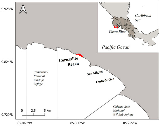 Corozalito (9°50′54.28″ N, 85°22′43.86″ W), located in the Southern Nicoya Peninsula, Guanacaste, Costa Rica (Figure 1), is a beach flanked to the north and south by rocky outcrops, with an associated wetland and river mouth to the south [12]. For monitoring purposes, only the available nesting area of the beach was divided transversally into 25 m sectors from north to south using numbered posts, which corresponded to 768 m of beach. Sector markers were placed in line with the vegetation, with numbers facing the water [27]. These sectors were then grouped into three main areas: the northern area (sectors 1 to 10), characterized by dense shrubs and low-lying trees, the central area (sectors 11 to 20), characterized primarily by high standing palm trees and little to no ground cover (this area also contains multiple picnic tables and a shelter), and lastly the southern area (sectors 21 to 30), that is primarily ground cover with some mangrove trees encircling the small estuary [12,27]. This beach in the Pacific of Costa Rica shows two seasons: a dry season, or “summer”, from January through June, and a rainy season, or “winter”, from July through December [12].