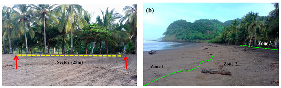 Division of the beach according to (a) sectors (markers indicated by arrows), and (b) zones in Corozalito (Photos: Espinoza-Rodriguez, 2019).
