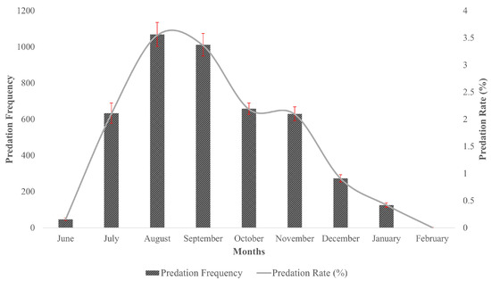 Predation rates showed a fluctuating trend during the sampling period, with increasing values over the years and four distinctive downfalls in 2010, 2014, 2016 and 2017 (Table 1). The lowest predation rate (4.711%) occurred in 2017 and the highest rate during the 2020 nesting season (28.35%). Alternatively, predation rates were the highest in August and September (3.55% and 3.36%, respectively), followed by a decreasing trend by the end of the season (Figure 3).
