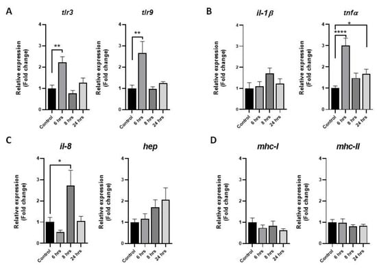 To understand and characterize the response of muscle cells against bacterial pathogens, rainbow-trout skeletal muscle cells were challenged with P. salmonis for 6, 8, and 24 h. Next, immune molecular markers tlr3, tlr9, il-1β, tnfα, il-8, hepcidin, mhc-I and mhc-II were measured with RT-qPCR, and results showed a concomitant overexpression of toll-like receptors 3 and 9 after 6 h of challenge (Figure 1A). Proinflammatory cytokines il-1β, tnfα and il-8 were modulated compared to the noninduced controls, where tnfα and il-8 were upregulated significantly after 6 and 8 h after the challenge, respectively (Figure 1B,C). Antimicrobial peptide hepcidin increased after 6, 8, and 24 h after the challenge, but no statistical significance was observed (Figure 1C). No changes were observed in the mRNA levels of mhc-I and mhc-II during the entire trial (Figure 1D).