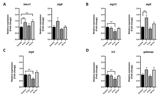Effect of P. salmonis challenge on the expression of autophagic genes in rainbow-trout muscle cells. Primary cultures of fish skeletal muscle were infected with P. salmonis at MOI 10 for 6, 8, and 24 h. As the control, cells without bacteria were sampled at the beginning of the trial (time 0). (A) Autophagic genes becn1 and atg9 involved in the induction of this process. (B) Autophagosome formation genes atg12 and atg5. (C) Gene atg4, involved in the elongation of the autophagosome. (D) Vesicle-completion-associated genes gabarap and lc3. The data are presented as means ± SEMs of triplicates from three independent experiments, using fold change compared to the values of the time 0 group (n = 3). qPCR analyses were normalized with the ef-1α and β-actin genes. The difference in transcript levels is denoted by asterisks (**) when the main effects were significant (p < 0.01).