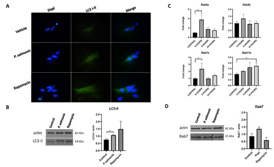 At the protein level, protein autophagic marker LC3-I/LC3-II was evaluated via immunofluorescence and Western blot. Agreeing with the gene expression of autophagic induction gene analysis, the protein content of LC3 showed an increase in fluorescence signal in the muscular cells challenged with P. salmonis compared with the control group at 6 h after challenge (Figure 3A). An increase in the LC3-II protein content was observed through Western blot analysis after 6 h of stimuli (Figure 3B). In addition, the mRNA levels of small GTPase proteins rab5a and rab7a were upregulated at 6 h after challenge, while the transcript level of rab11a was increased after 24 h (Figure 3C). Lastly, the protein content of Rab7 showed an increasing trend through Western blot (Figure 3D).