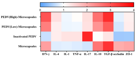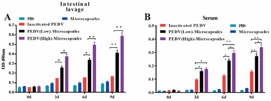 | PEDV (high) microcapsule | 1.987 ± 0.177 ** | 3.161 ± 0.191 ** |