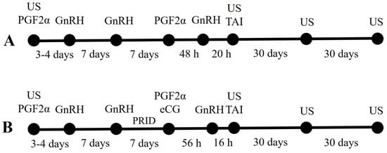 Preselect-OvSynch (A) and OvSynch+PRID+eCG (B) estrus synchronization protocols in dairy cows (US—ultrasound examination; PGF2α—prostaglandin F2 alfa; GnRH—gonadotropin-releasing hormone; PRID—progesterone-releasing intravaginal device; TAI—timed artificial insemination).