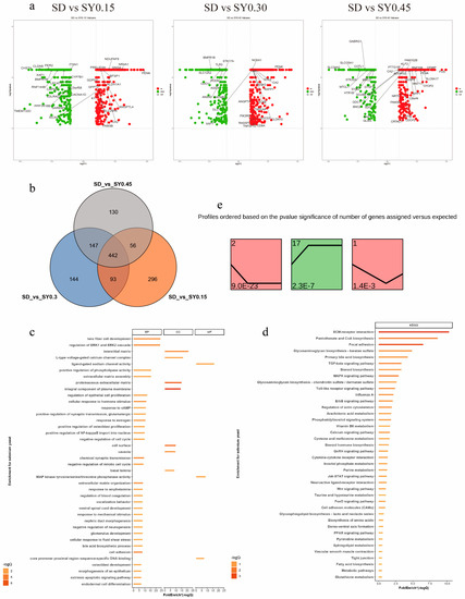 Transcriptome analysis revealed the effect on gene expression of shell gland in aged laying hens. (a) Scatter plots of DEGs (SD vs. SY0.15, SD vs. SY0.30, and SD vs. SY0.45). Red points represent upregulated genes with a log2 (fold change) > 1 and p < 0.05. Blue points represent downregulated genes with a log2 (fold change) < −1 and p < 0.05. Gray points represent genes showing no significant difference. Fold change = normalized gene expression in the SY0.15, SY0.30, and SY0.45 group/normalized gene expression in the SD group. (b) Venn diagram showing the distribution of DEGs in three comparisons of Se supplementation. The number of DEGs is indicated in the diagram. (c) Gene Oncology enrichment analysis of DEGs identified among the three conditions (SD vs. SY0.15, SD vs. SY0.30, and SD vs. SY0.45). (d) KEGG pathway enrichment analysis of DEGs identified among the three conditions (SD vs. SY0.15, SD vs. SY0.30, and SD vs. SY0.45). (e) Identification of 3 significant gene cluster profiles by STEM. Colored block trend: significant enrichment trend (p < 0.05). The number of genes in each significant cluster is shown after the cluster number.