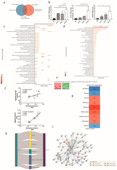 The potential molecular mechanism of selenium yeast affecting the eggshell strength in aged laying hens. (a) Venn diagram showing the distribution of DEGs associated with eggshell strength. (b) Validation of DEGs associated with eggshell strength using qRT-PCR, * means p < 0.05 and ** means p < 0.01. (c) Gene Oncology enrichment analysis of DEGs associated with eggshell strength (SY0.15 vs. SY0.45 and SD vs. SY0.45). (d) KEGG pathway enrichment analysis of DEGs associated with eggshell strength (SY0.15 vs. SY0.45 and SD vs. SY0.45). (e) Trend analysis of DEGs associated with eggshell strength expression. Colored block trend: significant enrichment trend (p < 0.05). (f) The linear correlation between shell gland selenium content with eggshell strength and eggshell selenium content. (g) WGCNA analysis identified specific transcriptional modules related to eggshell strength in aged laying hens after selenium yeast supplementation. (h) Sankey charts were performed among differential expressed genes in modules and pathways. (i) The PPI network of common genes in modules and DEGs.