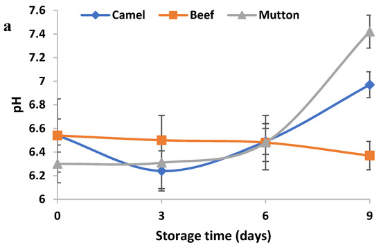 Mutton had a lower initial pH than that of beef and that of camel meat (Figure 1a). There were variations in the pH of the meat samples during storage. The pH of camel meat decreased after the first 3 days of storage and thereafter increased at day 9 of storage as compared with day 0. However, a nonsignificant reduction in pH was observed for the beef sample during storage. Meanwhile, the pH of the mutton sample (pH = 7.42) significantly increased at the end of storage and was reported to be highest among the meat samples (p < 0.05).