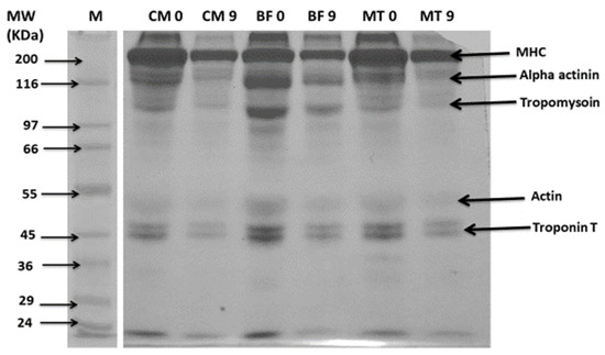 Sodium dodecyl sulphate polyacrylamide gel electrophoresis (SDS-PAGE) pattern of proteins extracted from camel meat, beef and mutton on day 0 and day 9 of refrigerated storage. Notes: CM 0 and CM 9; BF 0 and BF 9; and MT 0 and MT 9 denotes camel meat, beef and mutton on day 0 and on day 9 of storage, respectively.