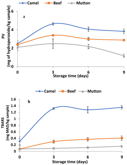Lipid oxidation is an important factor influencing the quality of meat by affecting its flavour, colour, texture and nutritive value. Similar to this study, a decrease in the PV during storage was reported in the PV of chicken leg and breast meat [37,38] during frozen storage. The rise in the PV in camel meat and beef may be due to the faster rate of peroxide formation during the first 3 days of refrigerated storage, followed by their degradation into secondary oxidation products during the extended storage period of 9 days. Also, the high PV found in the camel meat could be due to the higher haemoglobin and myoglobin contents of camel meat compared with those of beef and mutton [4] given that these iron-containing pigments have been found to be effective catalysts for lipid oxidation [18].