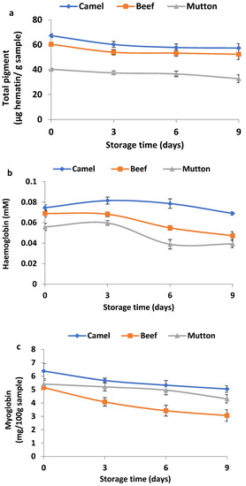 Changes in total pigment (a), haemoglobin content (b) and myoglobin content (c) in camel meat, beef and mutton during 9 days of refrigerated storage. Data are represented as mean ± SEM (n = 6).