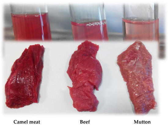Red meat is an important source of high-quality protein that provides all the essential amino acids [1] as well as several essential minerals, such as iron, zinc, copper and magnesium, that are required for optimal health and wellbeing [2]. Modern nutrition guidelines recommend reducing cholesterol and saturated fatty acid intake, which has subsequently affected consumers’ meat choice and preparation [3]. Camel meat is an inherently lean meat and has low fat content compared with other commercial red meats, such as beef and mutton [4]. Strong cultural and folklore beliefs that camel meat has medicinal benefits from its lower cholesterol concentration and relatively higher polyunsaturated fatty acids than beef have led to a higher preference for camel meat than meat from other domesticated species in several African and Middle Eastern countries [5,6,7].