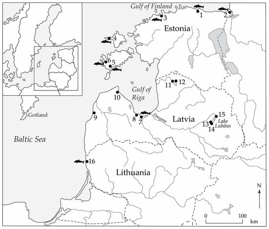 Neolithic sites with bone finds of porpoise (marked with porpoise symbol) and/or pottery with porpoise tooth impressions. 1—Kunda Lammasmägi; 2—Riigiküla; 3—Vabaduse Sq. in Tallinn; 4—Kõpu; 5—Naakamäe; 6—Loona; 7—Siliņupe; 8—Slocene; 9—Sārnate; 10—Pūrciems; 11—Riņņukalns; 12—Zvejnieki; 13—Malmutas grīva; 14—Suļka; 15—Piestiņa; 16—Šventoji.