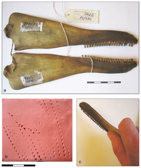 In addition to the faunal remains testifying to the porpoise’s importance as a source of meat and blubber for coastal communities in the Neolithic, a recent study has revealed that porpoise hunting also yielded a tool used to create a distinctive kind of pottery decoration. As described by Bērziņš and Dumpe [35], the elongated comb-like impressions consisting of a row of fine lenticular pits (Figure 4), previously documented as “fine teeth” [36] or as a special kind of comb decoration [37], are, in reality, impressions made with a row of porpoise teeth.