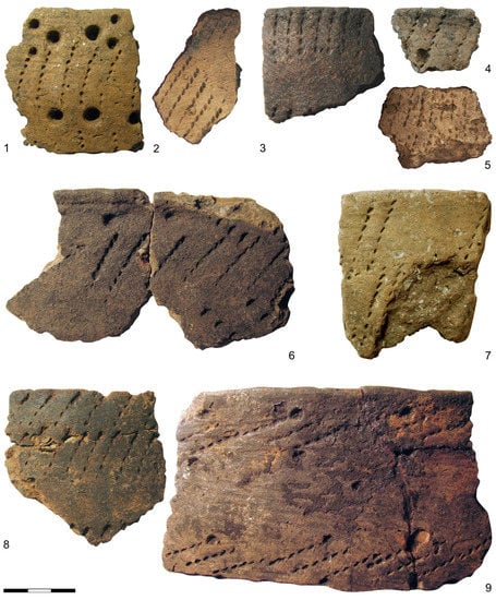 No other examples of pottery decoration with marine mammal bone or tooth impressions are known to the authors outside of the Baltic region. However, the widespread practice of impressing pottery with the serrated edges of Cerastoderma shells in the Neolithic period in south-western Europe (“Cardial pottery”) [51] and the use of the tips of marine snail shells for pottery decoration in Norway [52] (p. 111) might likewise be seen as reflecting the prominence of coastal resources in the world-view of the communities inhabiting these areas.
