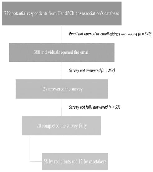 Using the Handi’Chiens association’s database (containing contacts of people with disabilities and service dogs), all listed recipients and their families were invited to participate in the survey. The survey was available online on LimeSurvey (i.e., an online surveying tool). We used the contact e-mail addresses in the database to email invitations to 729 potential respondents, providing detailed information about the aim of the survey, as well as the digital link to the online questionnaire. A total of 380 individuals opened the email, and 127 answered the survey (final rate of 17.4%). Among the 127 respondents, 70 completed the survey completely (58 by recipients and 12 by caretakers). A flow chart of the survey process is presented in Figure 1.
