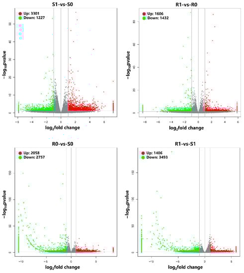 Volcano plots showing the transcriptional response of the four comparison groups. Differentially expressed genes (DEGs) are shown as red (upregulated) and green (downregulated) dots. Non-significantly expressed genes are shown as gray dots. The X-axis represents the value of log2 (fold change), and the Y-axis shows the value of −log10 (p-value).