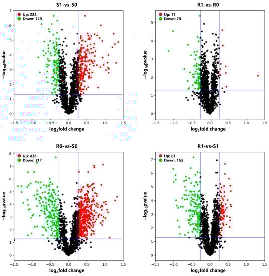 Volcano plots showing the differentially expressed proteins (DEPs) of the four comparison groups. DEPs are shown as red (upregulated) and green (downregulated) dots. Non-significantly expressed proteins are shown as black dots. The X-axis represents the value of log2 (fold change), and the Y-axis shows the value of −log10 (p-value).