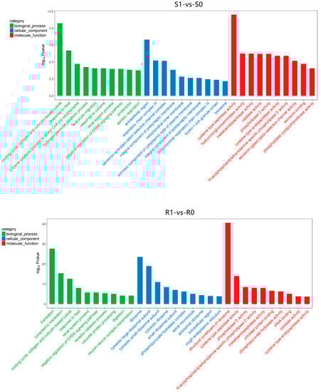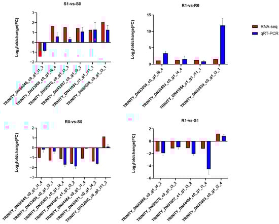 The transcriptome analysis detected 3301 upregulated and 1227 downregulated genes in the susceptible H. contortus strain after IVM treatment (S0-vs-S1), while 1606 upregulated and 1432 downregulated genes were detected after IVM treatment in the resistant strain (R0-vs-R1). Additionally, 2058 upregulated and 2757 downregulated genes were detected in the non-treated resistant strain compared with the non-treated susceptible strain (S0-vs-R0), while 1406 upregulated and 3493 downregulated genes were detected in the IVM-treated resistant strain compared with the IVM-treated susceptible strain (S1-vs-R1; Figure 1). Regarding proteomics, a total of 1549 proteins were identified, of which 354 (226 upregulated and 128 downregulated), 89 (11 upregulated and 78 downregulated), 655 (438 upregulated and 217 downregulated), and 236 (81 upregulated and 155 downregulated) proteins were differentially expressed in the four comparison groups, (S0-vs-S1, R0-vs-R1, S0-vs-R0, and S1-vs-R1, respectively; Figure 2). We also found that the total number of DEPs was much lower than the total number of DEGs. The expressions of the genes obtained through the RNA-seq were confirmed using qPCR, and the validation results are shown in Figure 3.