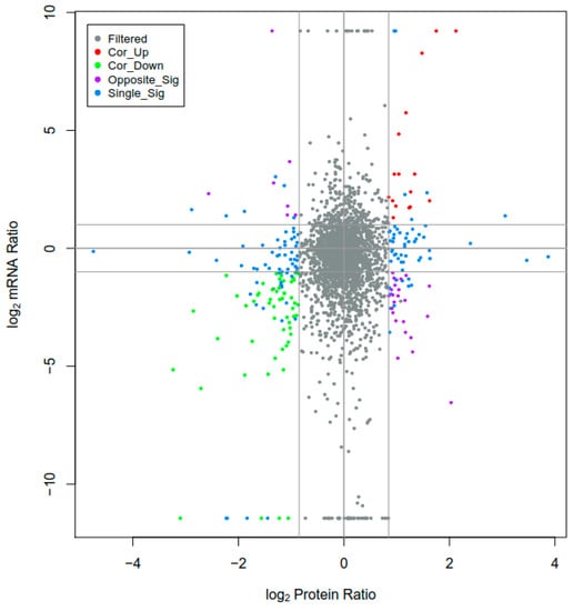 Relationship patterns of total mRNA and protein. The X-axis shows protein expression, and the Y-axis represents gene expression. Gray dots indicate genes and proteins with no significant difference, red dots represent upregulated genes and proteins, green dots represent downregulated genes and proteins, purple dots represent differentially expressed genes (DEGs) and differentially expressed proteins (DEPs) that show opposite regulation, and blue dots represent that one of the genes and proteins differ.