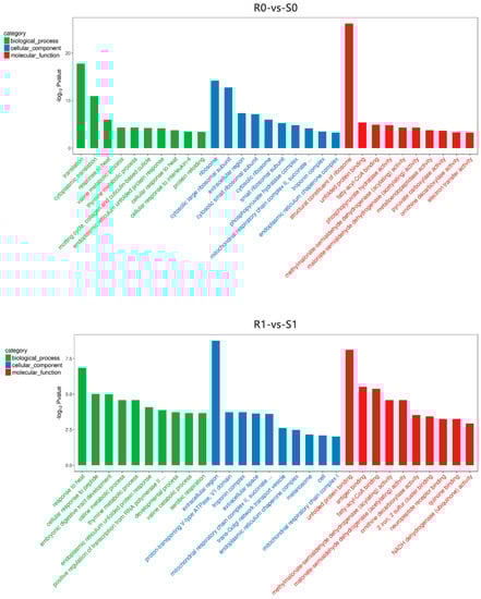 To identify the genes and proteins associated with drug resistance, we integrated the differentially expressed transcripts and proteins. As shown in Figure 4, almost all of the log2 mRNA:log2 protein ratios are concentrated in the center of the plot; these genes and proteins were filtered out, while the DEPs and DEGs were left in place. An integrated analysis of the transcriptome and proteome data revealed that the expressions of one gene and the corresponding protein (TRINITY_DN33068_c0_g1_i6_4) were upregulated and that two other genes (TRINITY_DN29476_c0_g1_i7_3 and TRINITY_DN42604_c4_g1_i6_1) were downregulated in the S0-vs-S1 group; one gene and the corresponding protein (TRINITY_DN35814_c0_g1_i8_2) were downregulated in the R1-vs-R0 group; one gene and the corresponding protein (TRINITY_DN43412_c0_g1_i1_3) were upregulated and nine were downregulated in the R0-vs-S0 group; and three genes and the corresponding proteins (TRINITY_DN30909_c0_g1_i3_1, TRINITY_DN38401_c0_g1_i1_1, and TRINITY_DN3919_c0_g1_i1_1) were downregulated in the R1-vs-S1 group (Supplementary Materials Figure S2).
