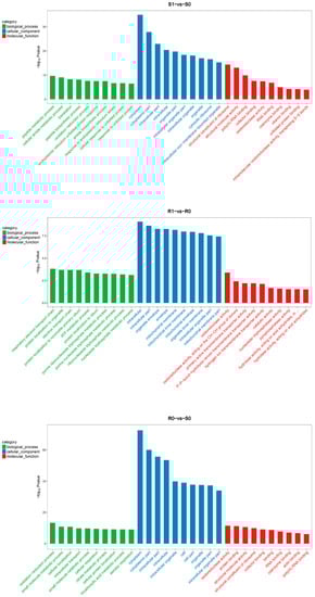 The 30 most significantly enriched gene ontology (GO) terms for the DEGs in the four comparison groups. The GO analysis results are summarized in three categories: biological processes (green), cellular components (blue), and molecular functions (red). The X-axis indicates different GO terms, and the Y-axis represents the corresponding number of genes in each GO term.