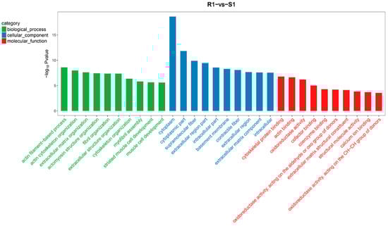 The 30 most significantly enriched gene ontology (GO) terms for the DEPs in the four comparison groups. The GO analysis results are summarized in three categories: biological processes (green), cellular components (blue), and molecular functions (red). The X-axis indicates different GO terms, and the Y-axis represents the corresponding number of genes in each GO term.