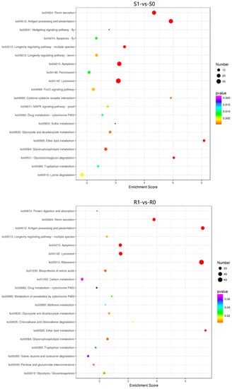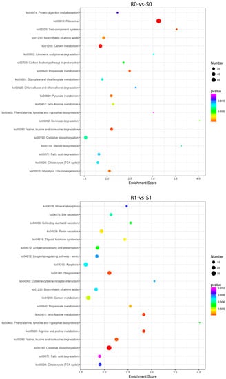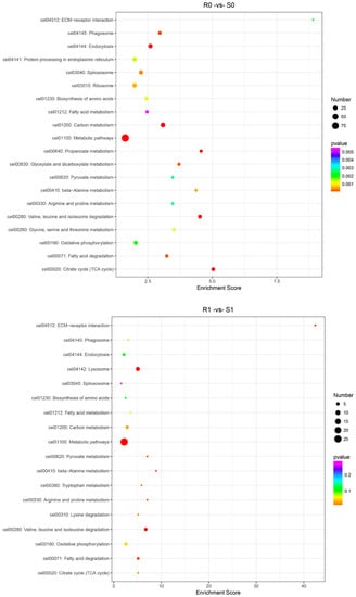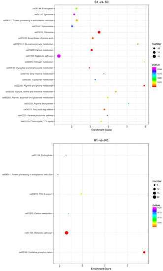 The KEGG enrichment analysis of the DEGs and DEPs revealed 4528 DEGs in the 186 KEGG pathways of the S1-vs-S0 group; 3038 DEGs were enriched in the 170 KEGG pathways of the R1-vs-R0 group; 4815 DEGs were enriched in the 231 KEGG pathways of the R1-vs-R0 group; and 4899 DEGs were enriched in the 230 KEGG pathways of the R1-vs-R0 group. We selected the 20 most significantly enriched KEGG pathways according to the enrichment scores. These DEGs were significantly enriched in the pathways related to xenobiotic metabolism by cytochrome P450, amino acid degradation, the biosynthesis of amino acids, drug metabolism–cytochrome P450, carbon metabolism, and the tricarboxylic acid (TCA) cycle (Figure 7). The DEPs were significantly enriched in the pathways related to carbon metabolism, the TCA cycle, endocytosis, ABC transporters (MRPs, Pgps), and drug metabolism–other enzymes (UGT, GST) (Figure 8). Overall, these DEGs and DEPs were enriched in pathways related to the decomposition, metabolism, and synthesis of substances; this result is consistent with that of the GO enrichment analysis. These genes and proteins may play an important role in the response to the metabolism of anthelmintics in susceptible and resistant strains.
