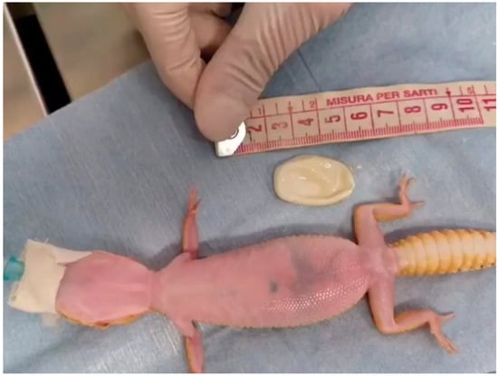 Dystocia (egg binding) in reptiles is a common, multifactorial disease []. Different factors of captivity are often related to the occurrence of dystocia, such as inadequate husbandry (improper temperature gradients or humidity levels, inadequate nesting sites, overcrowding), poor physical conditions (illness, dehydration, malnutrition), reproductive apparatus disorders (infectious diseases, traumatic injuries, misshapen or large eggs), and metabolic diseases (hypocalcemia secondary to nutritional or renal hyperparathyroidism) [,]. Two common forms of reproductive disorders in reptiles are recognizable: preovulatory follicular stasis and postovulatory stasis or egg binding. The first form occurs when egg development stops prior to ovulation after vitellogenesis, resulting in persistent follicles and leading to inflammation and eventually rupture, coelomitis, and death [,,]. The second form, the postovulatory stasis, occurs when the eggs are not laid and retained inside the oviduct for an indefinite period of time, or ectopic [,,,]. In both conditions, the animal can refuse to eat and its conditions can deteriorate rapidly, leading it to death [,]. The diagnosis of postovulatory stasis is usually made by X-ray [,,] due to the radiopacity of the eggshell. Retained eggs can become overcalcified and appear more radiopaque on radiographic images []. Egg presence can also be assessed through careful palpation of the mid- or caudal coelom. Vitellogenic follicles during preovulatory stasis are better visualized and even measured through ultrasound or CT scan [,,,]. Treatment for dystocia can be either medical or surgical. Medical treatment involves the administration of oxytocin (1 to 10 UI/kg) intramuscularly (IM) or the administration of arginine vasotocine [,]. Oxytocin seems to work better in chelonians than in snakes and lizards []. It is generally used one hour after IM calcium gluconate administration, especially if the blood calcium level is low [,]. Arginine vasotocine seems to be more effective in reptiles than oxytocin, but the short storage life, high cost, and unlicensed use make this medical treatment option problematic in clinical practice []. Percutaneous ovocentesis is often reported by some authors as a treatment of dystocia in geckos []. However, it carries a high risk of organ rupture, with consequent coelomitis. If the eggs can be visualized through the cloacal opening, ovocentesis can be performed to make the eggs collapse and therefore be removed more easily []. Hormonal therapy, such as deslorelin implants, seems to be ineffective in suppressing ovarian activity in leopard geckos [,] and its use is still under debate in other reptiles [,,]. In cases where medical treatment fails or is not applicable, surgery remains the elective choice. Ovariectomy or ovariosalpingectomy is resolutive [,,].
