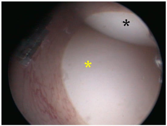 Cloacoscopy. Endoscopic view of the right (black asterisk) and the left (yellow asterisk) egg protruding from the vagina to the cloaca.