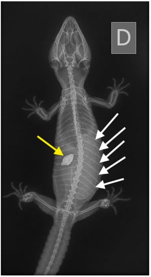 The gecko recovered 15 min after the end of the procedure, and no adverse effects were noted. Warm fluids (ringer solution) were administered subcutaneously at 15 mL/kg/die at the end of the endoscopic procedure to support the renal function after the anesthesia. Assisted feeding (Emeraid IC critical care formula, Emeraid LLC, A Division of Lafeber, Cornell, IL, USA) was administered once a day as nutritional support. Five days after the procedure, the gecko started to eat, so it was discharged. One month later, the gecko’s weight had increased by 5 g, and she was active and in good nutritional status. One year later, the gecko laid six infertile eggs, but dystocia had not occurred.