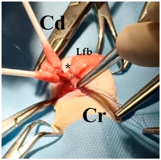Case 3: Surgery. Left ovarian stalk (black asterisk) ligature during the ovariosalpingectomy intervention. Cr: cranial. Cd: caudal. Lfb: left fat body.