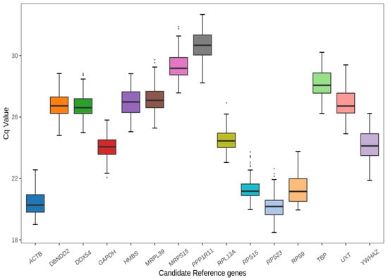 The mean Cq values of all tested samples calculated to determine the expression levels of the 15 CRGs are illustrated in Figure 1. Cq value had a negative correlation with gene expression level. In other words, higher gene expression levels are associated with lower Cq values and vice versa. The Cq values of all CRGs ranged from 18.49 to 32.67. For each CRG, the mean and median Cq values were relatively close. Among all the CRGs, RPS23 demonstrated the highest expression level, with Cq = 20.18 ± 0.76, while PPP1R11 had the lowest expression level, with Cq = 30.59 ± 0.89.