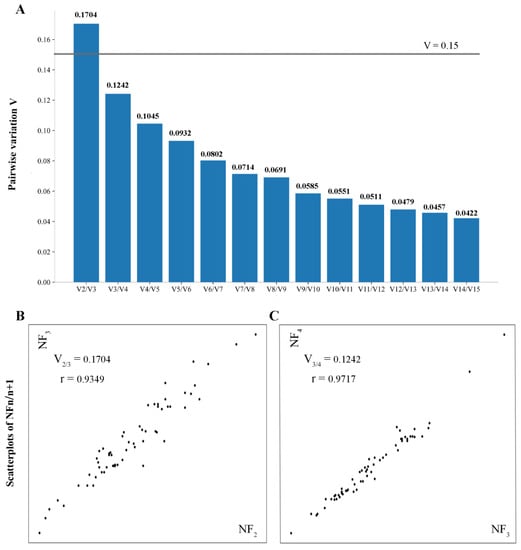 The best number of reference genes for RT-qPCR. (A) Pairwise variation (Vn/n + 1) analyses of 15 CRGs. The y-axis indicates Vn/Vn + 1 between the calculation of the NFn using the most stable reference genes and the NFn + 1 using an addition of the next most stable reference genes. The gray line depicts the cut-off value (V = 0.15). (B,C) NFn/n+1 scatterplots before and after the addition of (n + 1) reference gene (x-axis and y-axis). The NFn was calculated using the geometric mean of the RQ data of n CRGs. r: Spearman rank correlation coefficient.