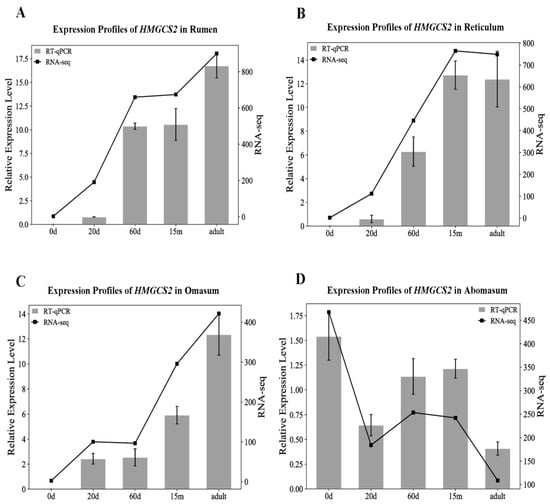 Expression profiles of HMGCS2 in (A) rumen, (B) reticulum, (C) omasum and (D) abomasum at five developmental stages (0 d, 20 d, 60 d, 15 m and adult). Relative expression level: the RT-qPCR data of HMGCS2 were normalized using RPS15, MRPL39 and RPS23. RNA-seq: the arithmetic mean values of FPKM from samples in triplicate at each developmental stage in transcriptome sequencing results.